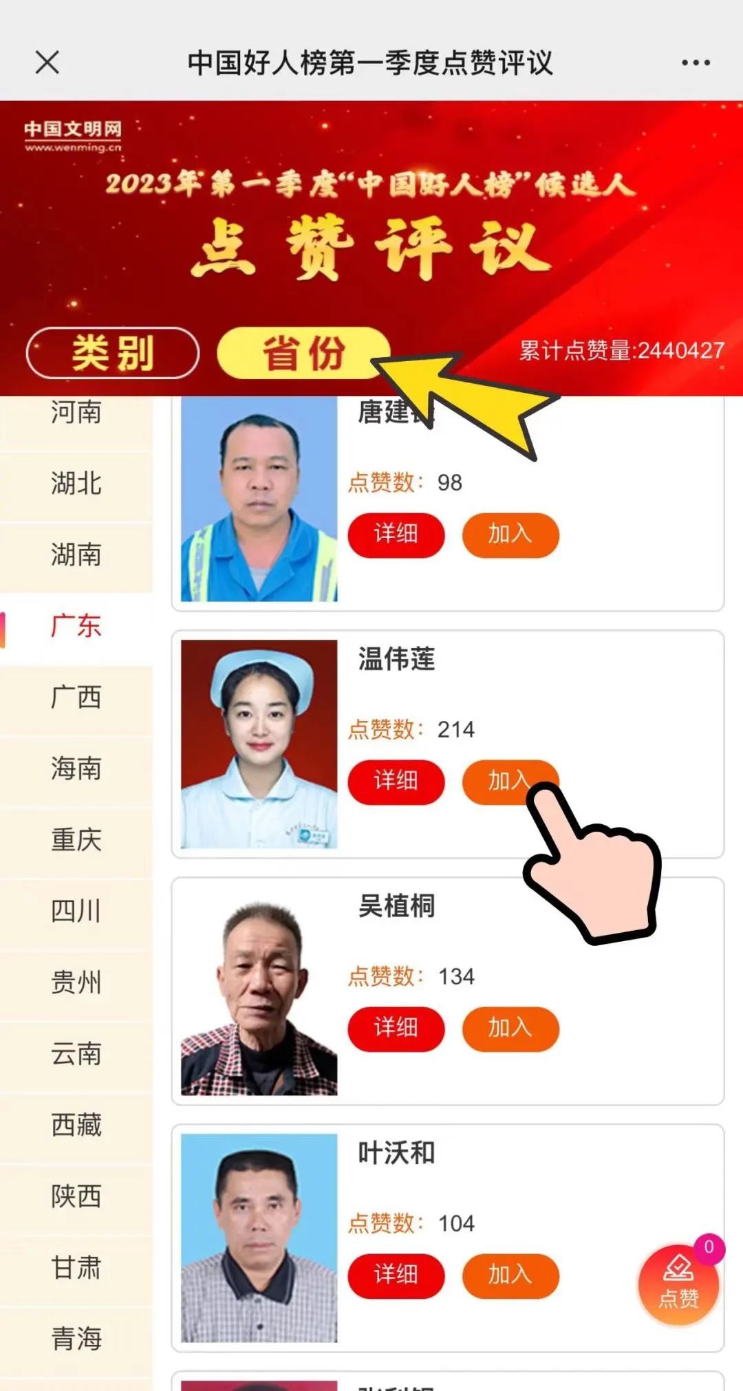 1.選擇“省份”-“廣東”分類,選擇溫偉蓮“加入”,點擊右下角“點贊”圓形圖標