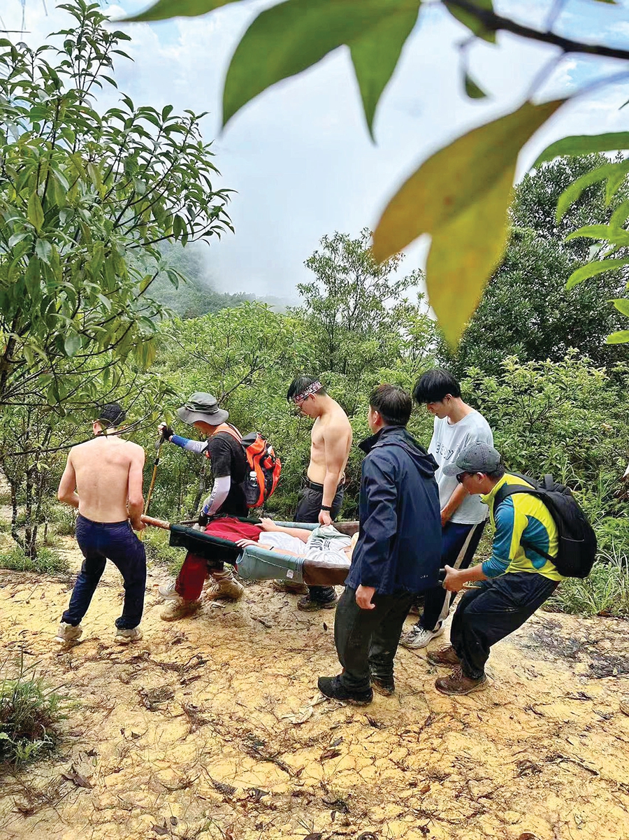 上山容易下山難,加之雨后陡峭的山路格外濕滑,徒手下山都容易摔跤,更何況抬著一個人。為了確保不讓擔架上的女孩摔出來,胡朝俊和同伴楊偉聰、呂開亮、鄭永金、鄭錦昌、戴云光等人抬著擔架兩側(cè)的前中后,盡可能快地抬著下山。一路上,女孩有時突然驚起,同行的人連忙安慰:“你放心,別怕,我們會抬你下山的!”看到女孩似乎要昏睡過去,拼友們又輕輕拍醒她,不讓她睡過去。