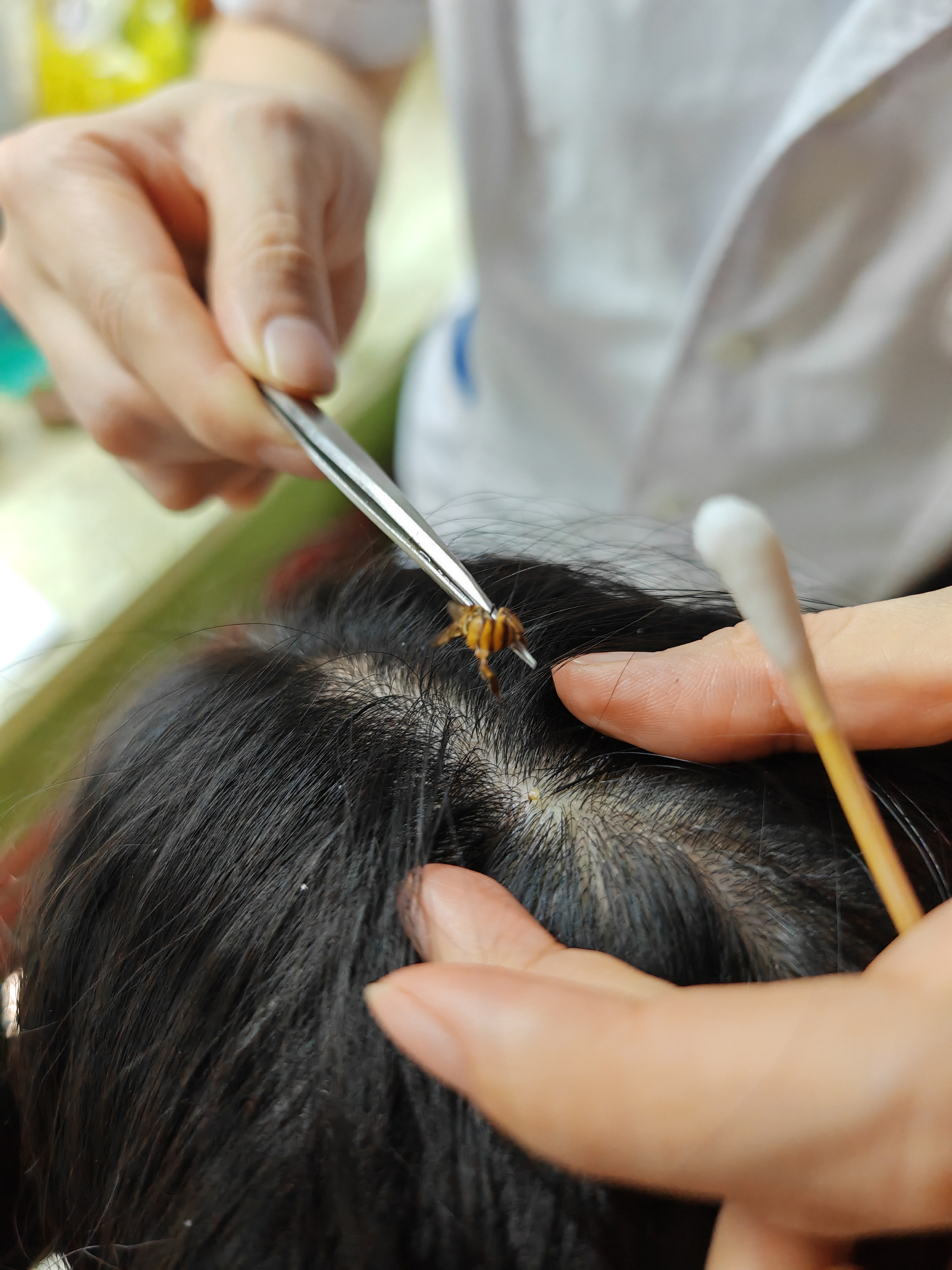 市民葉杏妮拇指關節疼痛,腰也痛。醫務人員用鑷子從一個透明盒子里取出一只蜜蜂,對準她手上和腰部的穴位輕輕一點,蜜蜂尾部的蜇針就扎了進去。