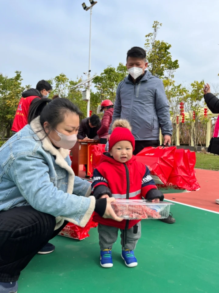 小寶寶手捧豬肉,愛不釋手。為讓村民更加深刻地感受到鄉村振興帶來的好處,在春節來臨之際,金星村組織開展此次分豬肉活動,一方面給村民送新春福利,另一方面通過這一富有儀式感的活動,鼓勵村民繼續積極支持、參與鄉村振興,一起創造更加美好的生活。