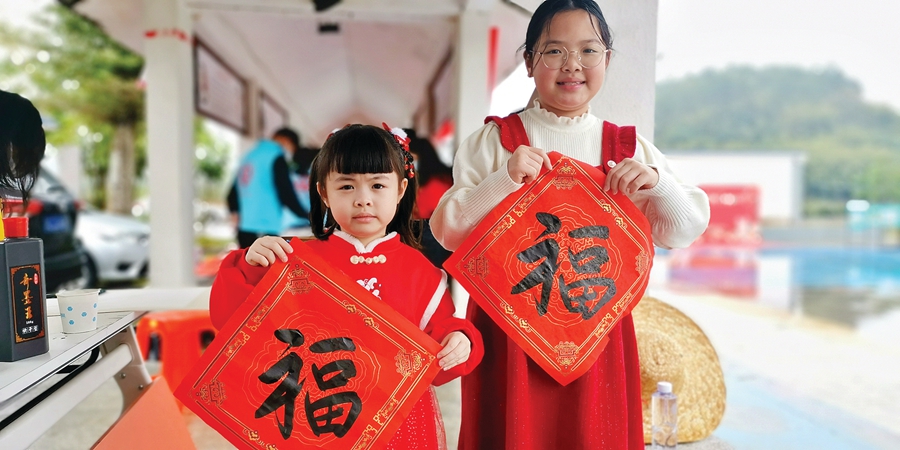 聽到有送春聯活動,5歲的羅佳怡(左)和10歲的表姐黃文靜特意換上過年的新衣服來到活動現場。