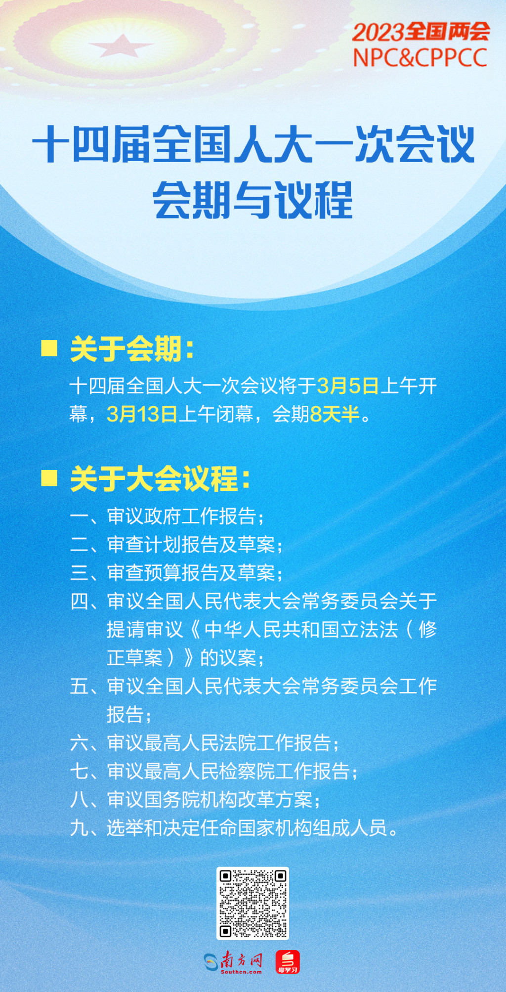 十四屆全國人大一次會議將于3月5日上午開幕,3月13日上午閉幕,會期8天半。