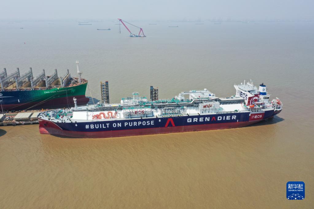 2022年5月16日拍攝的中國船舶集團旗下江南造船建造的99000立方米B型艙超大型乙烷運輸船H2625船(無人機照片)。新華社記者 丁汀 攝