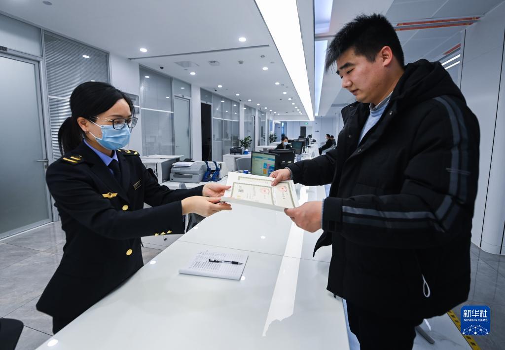 企業負責人在浙江省湖州市吳興區的中小微企業一站式服務平臺領取營業執照(2023年2月8日攝)。新華社記者 徐昱 攝