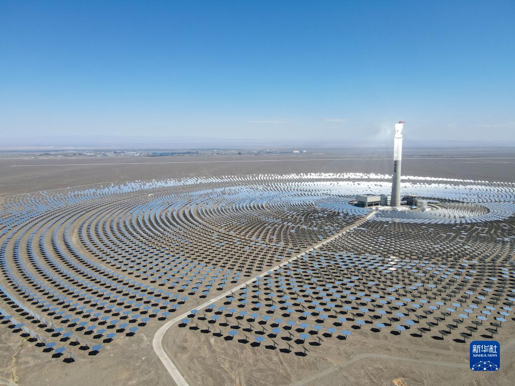 2021年8月22日拍攝的新疆伊吾縣淖毛湖鎮的哈密50兆瓦熔鹽塔式光熱發電站(無人機照片)。新華社記者 高晗 攝