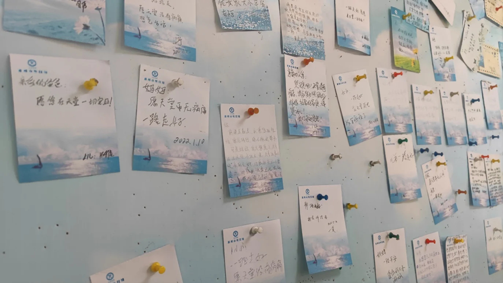 殯儀館內(nèi)家屬寫給逝者的留言。