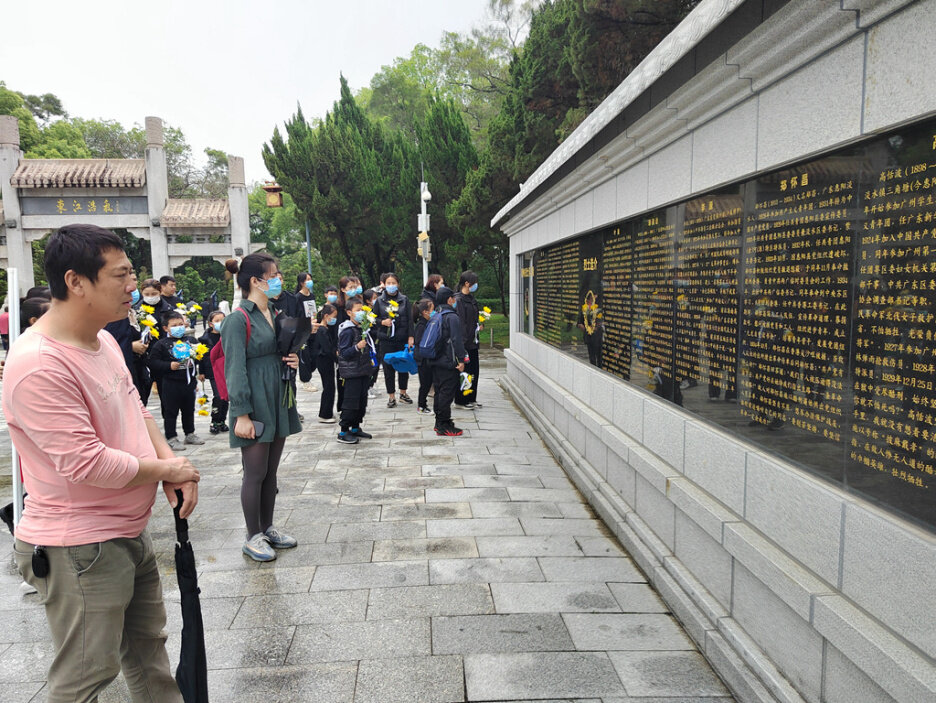 家長帶著孩子來到東江人民革命烈士紀(jì)念碑前獻(xiàn)花。