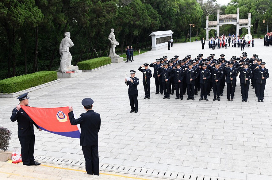 4月3日上午,惠州鐵路公安處機關、惠州地區所隊干部民警代表50余人前往惠州市豐山公園開展祭奠英烈活動;顒又,大家手持菊花,整齊肅立在東江人民革命烈士紀念碑前,致敬默哀,緬懷英烈們的豐功偉績,表達哀思敬意。默哀完畢后,全體人員面向警旗,高舉右拳莊嚴宣誓,重溫入警誓詞。隨后,大家拾階而上,緩步繞行,瞻仰紀念碑,敬獻鮮花。