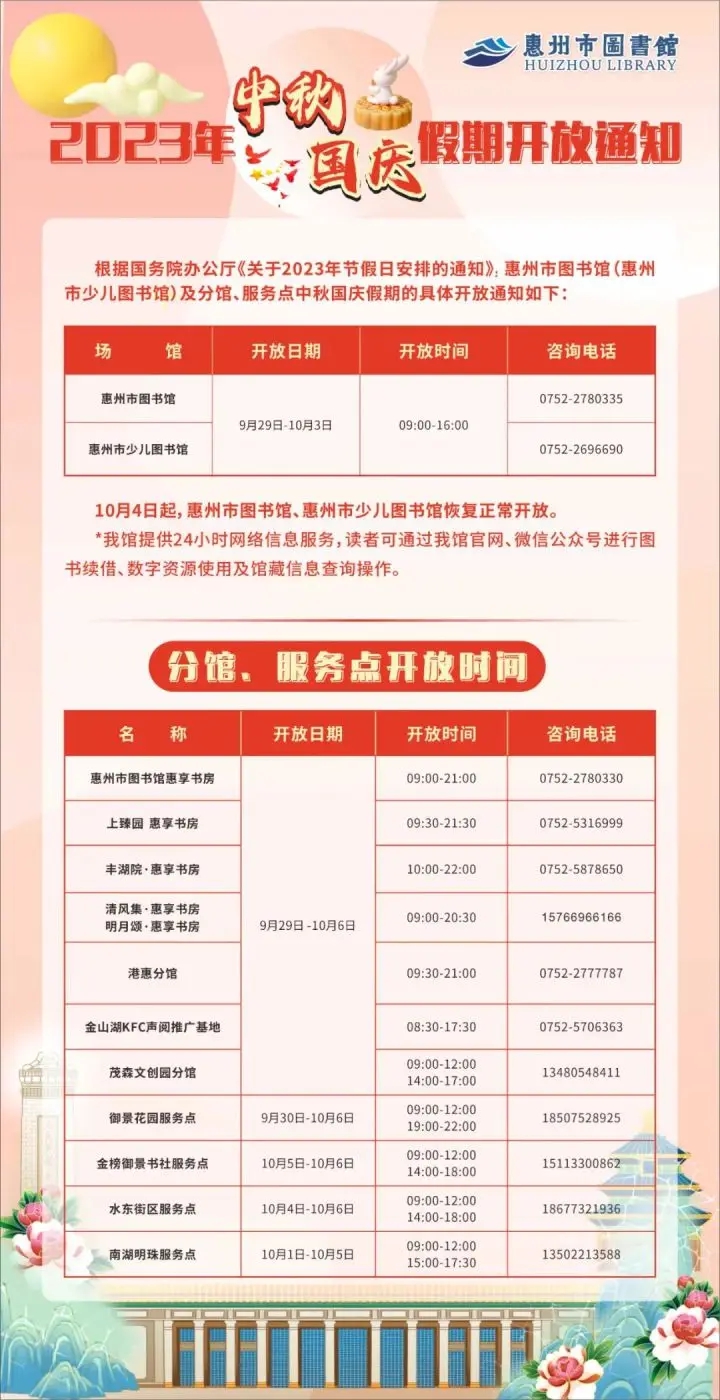 2023年中秋國慶將至,為深入推進全民閱讀工作,豐富市民讀者的節日文化生活,9月25日,記者從惠州市圖書館獲悉,該館中秋國慶假期精心準備了30項共36場閱讀推廣活動,靜候廣大市民前來品書香、享閱讀。具體活動詳情請關注“惠州市圖書館”微信號。