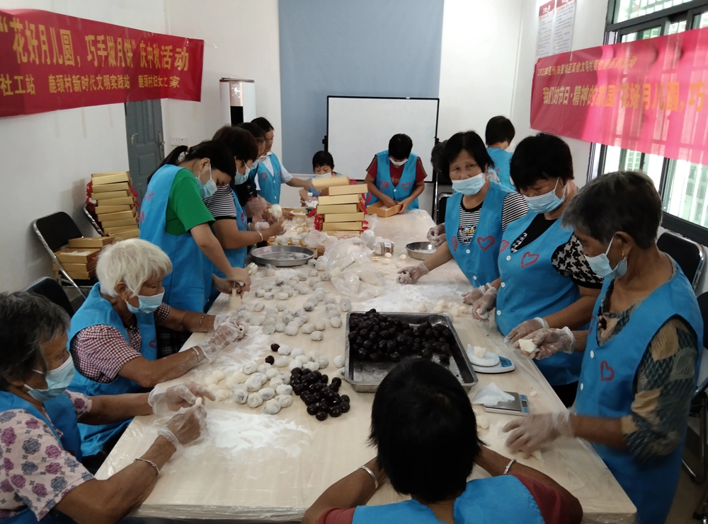 活動當天,“雙百”社工和志愿者們早早來到鹿頸村中的活動室,打掃衛(wèi)生、布置好場地、觀看冰皮月餅的制作過程,然后分工合作,在大家的共同努力下制作了800個月餅。隨后,把制作好的月餅分裝,再由志愿者和“雙百”社工分批把剛出爐的月餅送給村中的困難群眾手中。