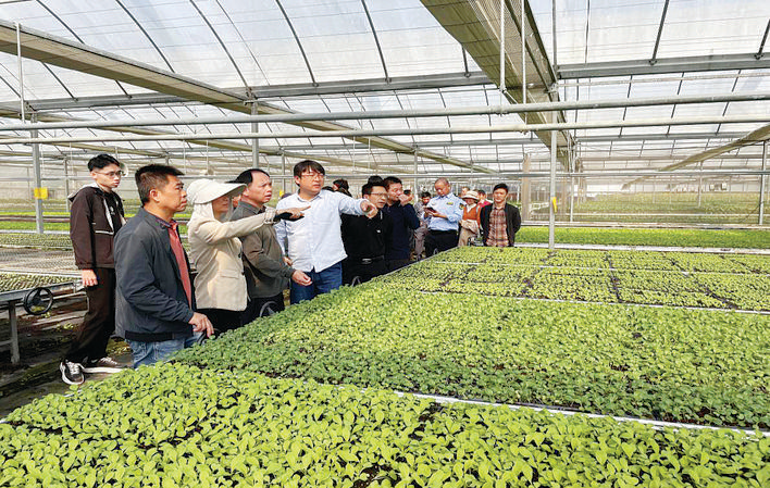“水培大棚一畝地可擺放10個水培架,每畝一次大概能產2400斤左右,夏天1500斤左右。水培葉菜類(黃金快菜)一般上架27天后可采摘,一年可以循環12次,一個月一次……”在蔬菜有機基質綠色水培示范區里,代表們圍在惠州市智慧未來農業科技有限公司總經理黃國順身邊,興致勃勃地聆聽他對此次觀摩會主栽品種——黃金快菜日常管理、產量和效益的介紹。