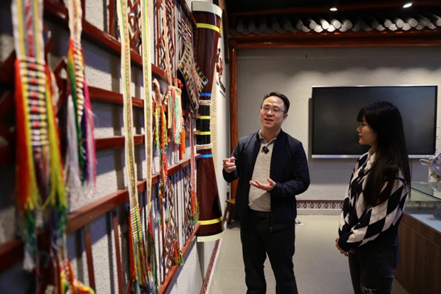 駐藍(lán)田瑤族鄉(xiāng)幫鎮(zhèn)扶村工作隊(duì)隊(duì)長(zhǎng)邱歡正在向記者介紹藍(lán)田瑤族鄉(xiāng)文化展覽館內(nèi)陳列的各類展覽品。