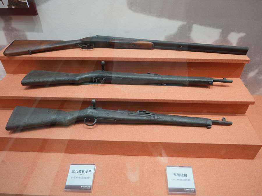 上一:雙管獵槍(東縱戰士鄧秀芳用過的雙管獵槍),下二下三:三八騎兵步槍(仿真)(由廣東東江縱隊紀念館捐贈)。