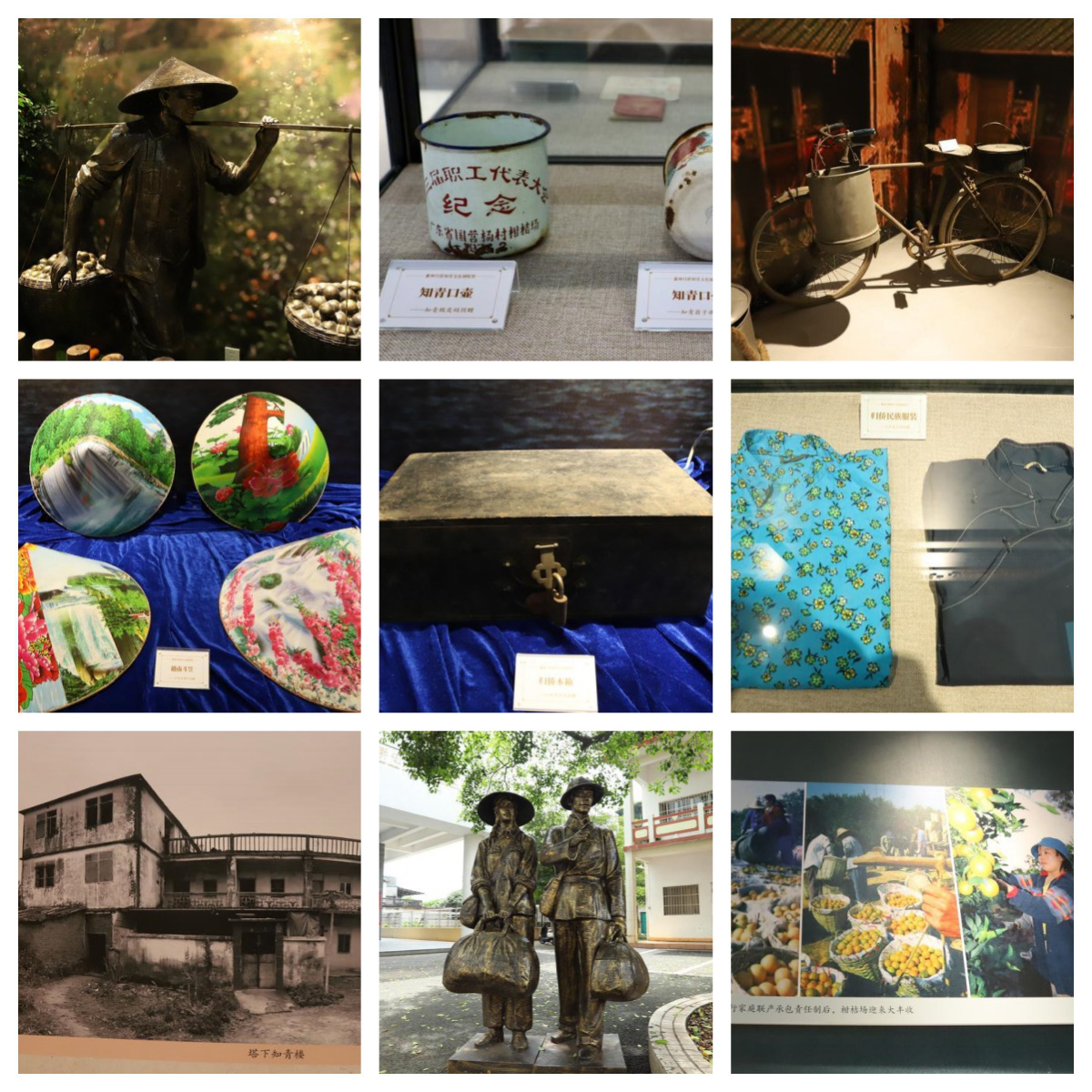 上左:銅像還原當(dāng)年柑橘豐收?qǐng)鼍啊?上中:知青使用過(guò)的口壺。 上右:歸僑使用過(guò)的自行車(chē)。 中左、中中:歸僑使用過(guò)的木箱、斗笠。 中右:歸僑服飾。 下左:知青樓舊照。 下中:還原當(dāng)年歸僑知青形象的銅像。 下右:當(dāng)年柑橘豐收?qǐng)鼍啊?/font>