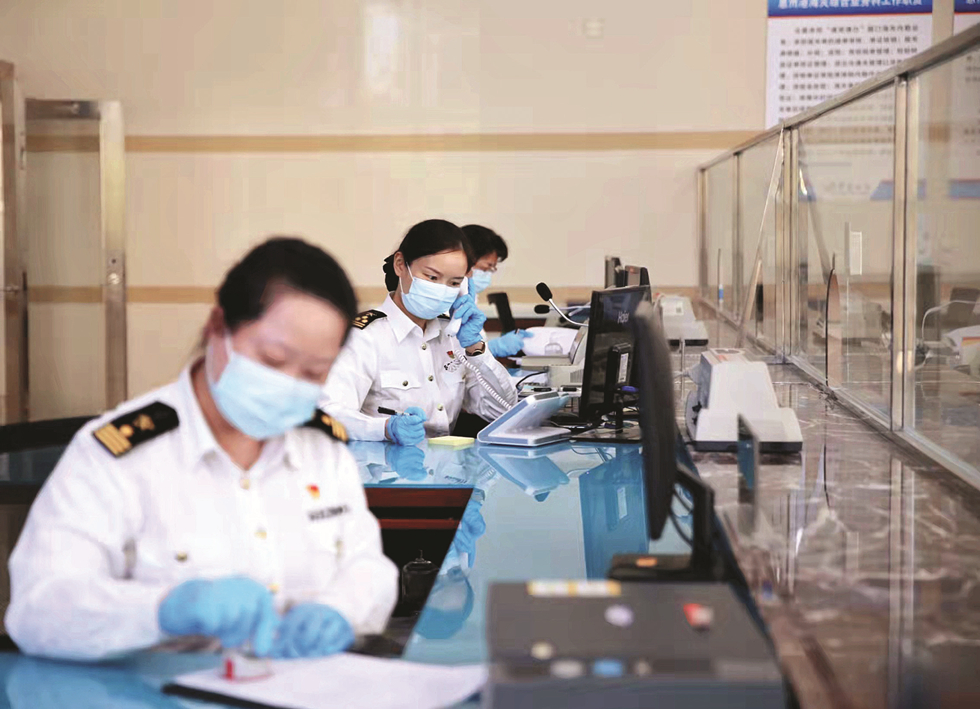 惠州港海關工作人員在服務大廳前臺忙碌著。惠州東江圖片社供圖