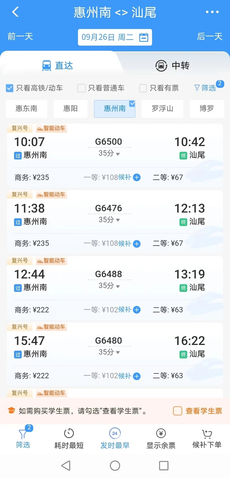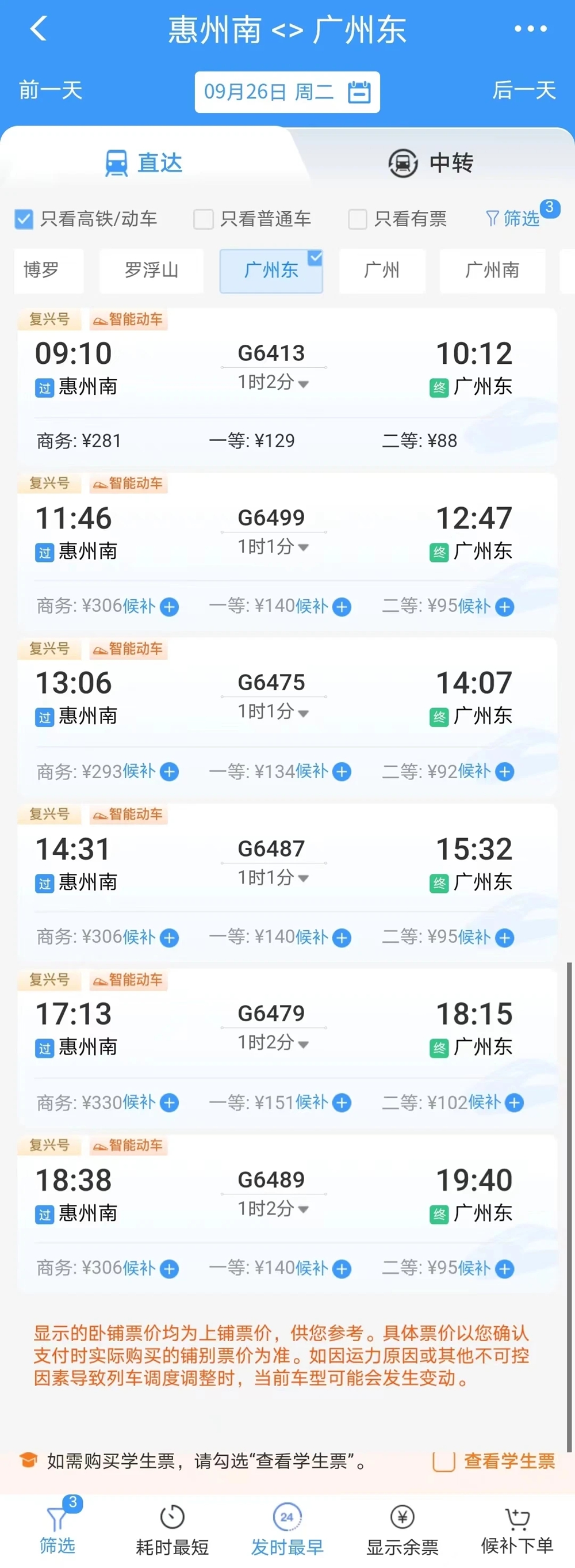 記者在中國鐵路12306網站(12306手機客戶端)查詢看到,9月26日惠州南至廣州東開行6趟動車,首趟車用時1小時2分,商務座281元,一等座129元,二等座88元;其余5趟車用時1小時1分,二等座從92元到102元不等。