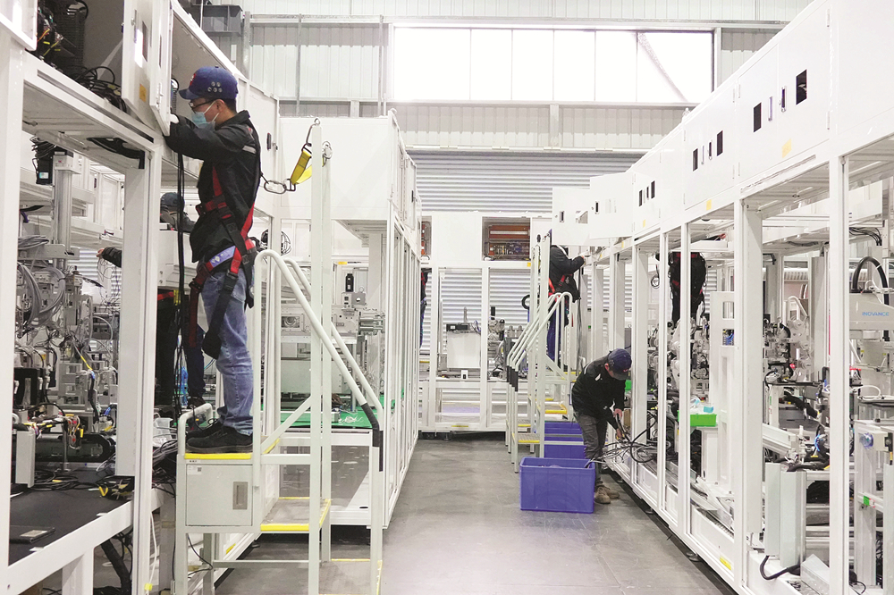 工人在利元亨動力電池總裝生產(chǎn)車間作業(yè)。