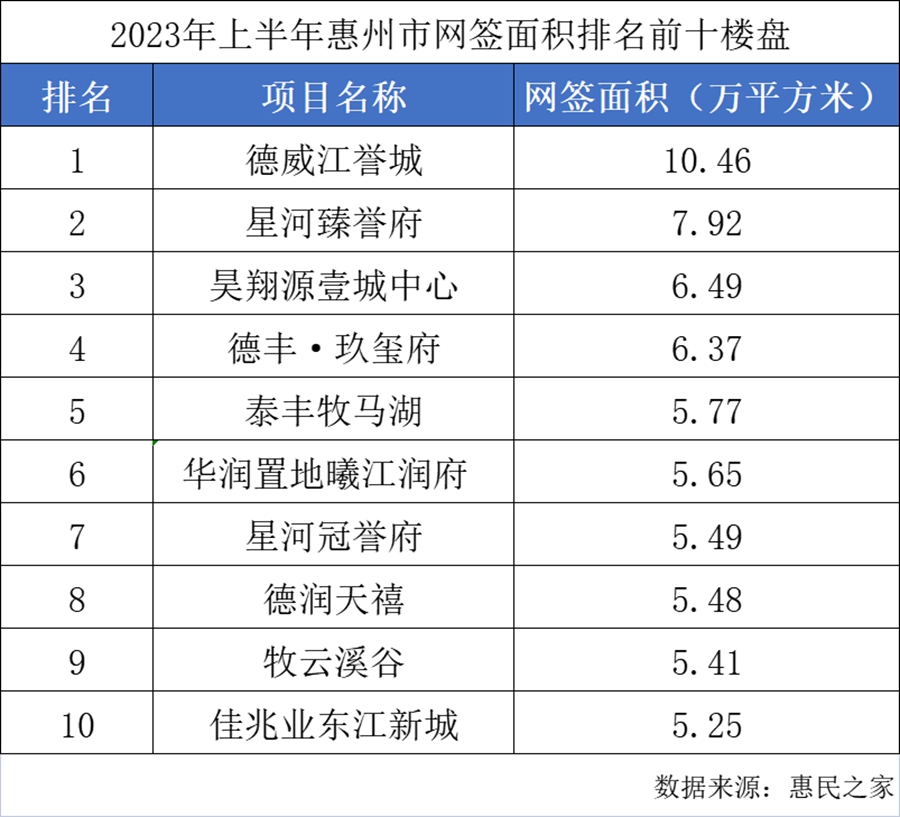惠民之家數據研究中心公布數據顯示,2023年上半年惠州市網簽面積排名前十的樓盤分別是德威江譽城(10.46萬㎡)、星河臻譽府(7.92萬㎡)、昊翔源壹城中心(6.49萬㎡)、德豐·玖璽府(6.37萬㎡)、泰豐牧馬湖(5.77萬㎡)、華潤置地曦江潤府(5.65萬㎡)、星河冠譽府(5.49萬㎡)、德潤天禧(5.48萬㎡)、牧云溪谷(5.41萬㎡)、佳兆業東江新城(5.25萬㎡)。