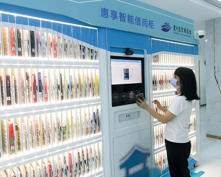 讀者在市民服務中心操作“惠享智能借閱柜”借閱書籍。