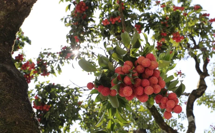 一棵棵荔枝樹枝頭結滿了紅彤彤的果實,像極了飽滿而小巧玲瓏的燈籠。