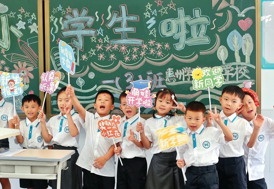 課桌上插上了紅氣球,還有棒棒糖、旺仔牛奶、蛋糕……不明就里的還以為是哪家豪橫地在開生日派對,殊不知這是開學課堂里的場景。