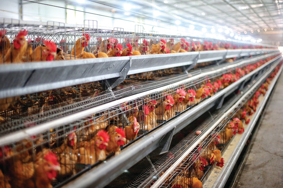 這間種雞室4列3層立體雞籠,每列雞籠長60米,可養10000只種雞。自動調溫系統,可保持雞舍在30℃以下恒溫,搭配調控風機、濕簾等設備,能提供舒適的環境;自動物料系統,能完成飼料和水的自動補給、喂投;自動清糞系統,通過清糞帶將雞糞自動傳送、打包,飼養員只需清潔籠架兩側供人行走的地面。