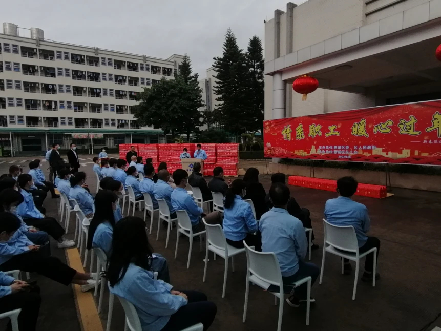 惠州日報訊 (記者彭紅霞 通訊員馮雪輝)1月24日上午,雖然天氣有點陰冷,但位于惠城區金龍大道邊的惠州住潤電裝有限公司廠區內卻暖意融融。在惠城區委區政府統籌指導下,由惠城區總工會開展的“情系職工 暖心過年”新春送溫暖進企業活動走進該公司,將3000份紅彤彤的大禮包和新春祝福送給公司留惠過年的員工,表達黨和政府及工會組織對職工群眾的關懷。