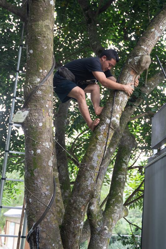 日前,剛走進古欖園,記者便聽到陣陣打烏欖聲。古欖園里有208棵古欖樹,大部分為烏欖,每棵欖樹的樹齡都超過了100年,枝繁葉茂,樹高接近或者超過10米,烏欖就結在高高的樹上。因此,打烏欖并不是一件易事,需要爬樹。