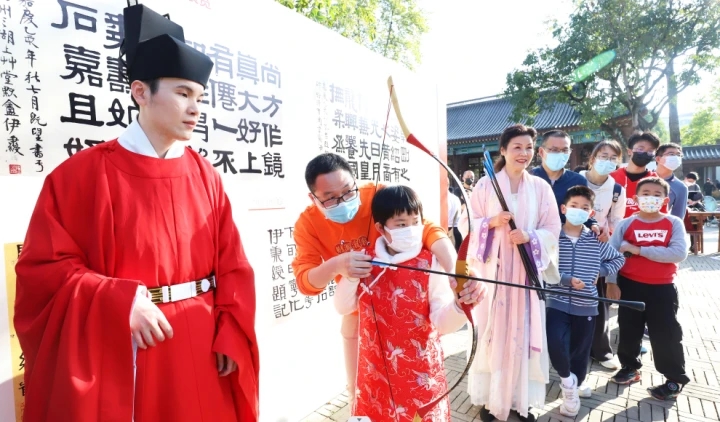 1月22日,“惠新年 書院雅集”古裝游園專場在豐湖書院舉行,市民游客體驗射箭。惠州日報記者鐘暢新 攝