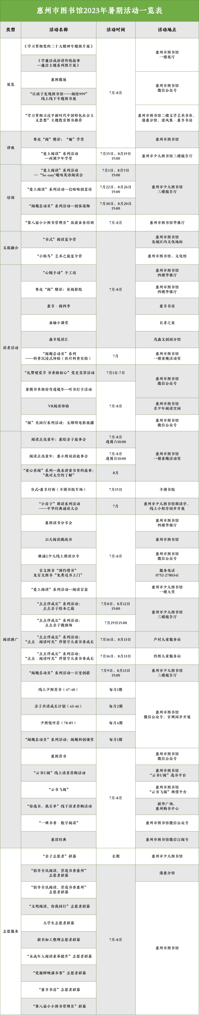 2023年暑假如期而至,為深入推進全民閱讀工作,滿足讀者多元化的文化需求,惠州市圖書館將開啟暑期“炫閱模式”,精心準備56項共170場閱讀推廣活動,靜待廣大市民過來品書香、覓清涼。