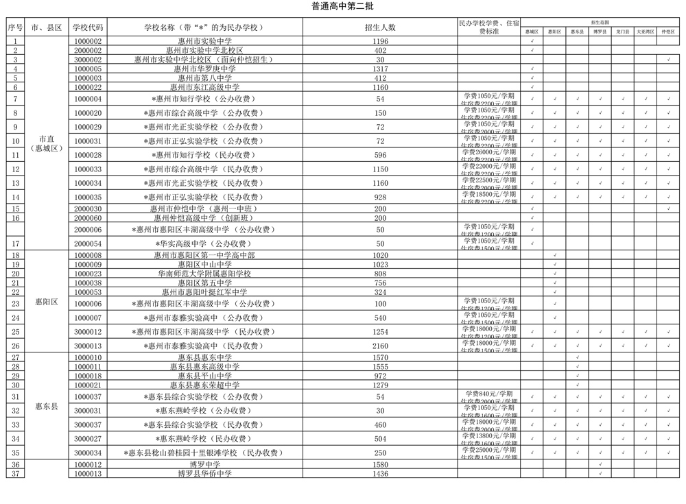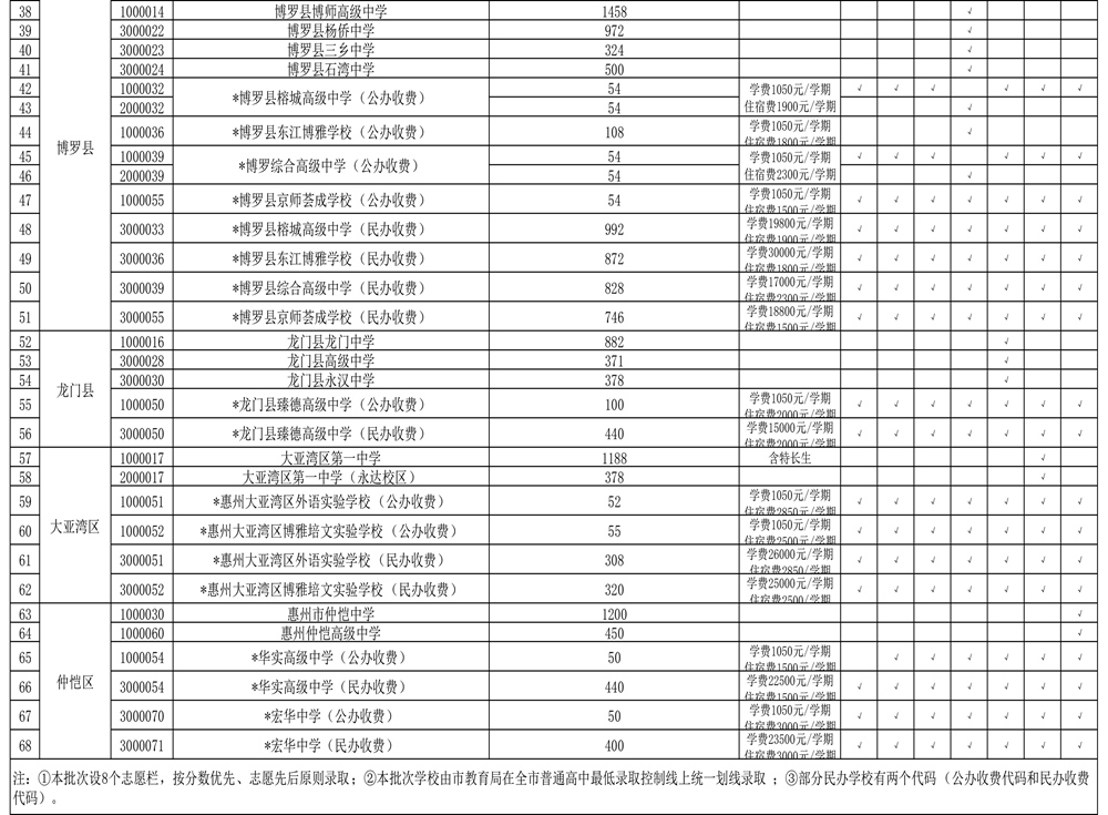 市實驗中學北校區面向仲愷高新區招生30人,仲愷中學(惠州一中班)面向惠城區和仲愷高新區招生200人,仲愷高級中學(創新班)面向惠城區招生200人,惠陽區豐湖高級中學(公辦收費)面向惠城區招生50人,華實高級中學(公辦收費)面向惠城區招生50人。