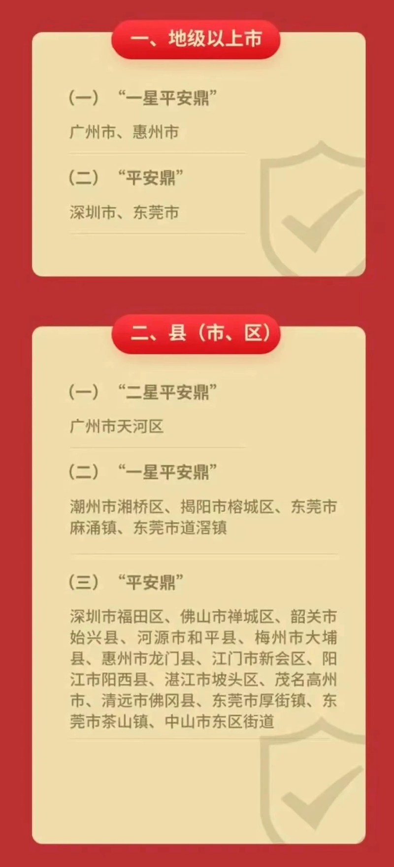 為發揮先進示范引領作用,進一步激發各地積極性、主動性、創造性,全面提升平安廣東建設科學化、社會化、法治化、智能化水平,廣東首次在省級層面開展“平安鼎”頒授活動。省委平安廣東建設領導小組辦公室決定授予廣州市、惠州市“一星平安鼎”;授予惠州市龍門縣等14個縣(市、區)“平安鼎”。
