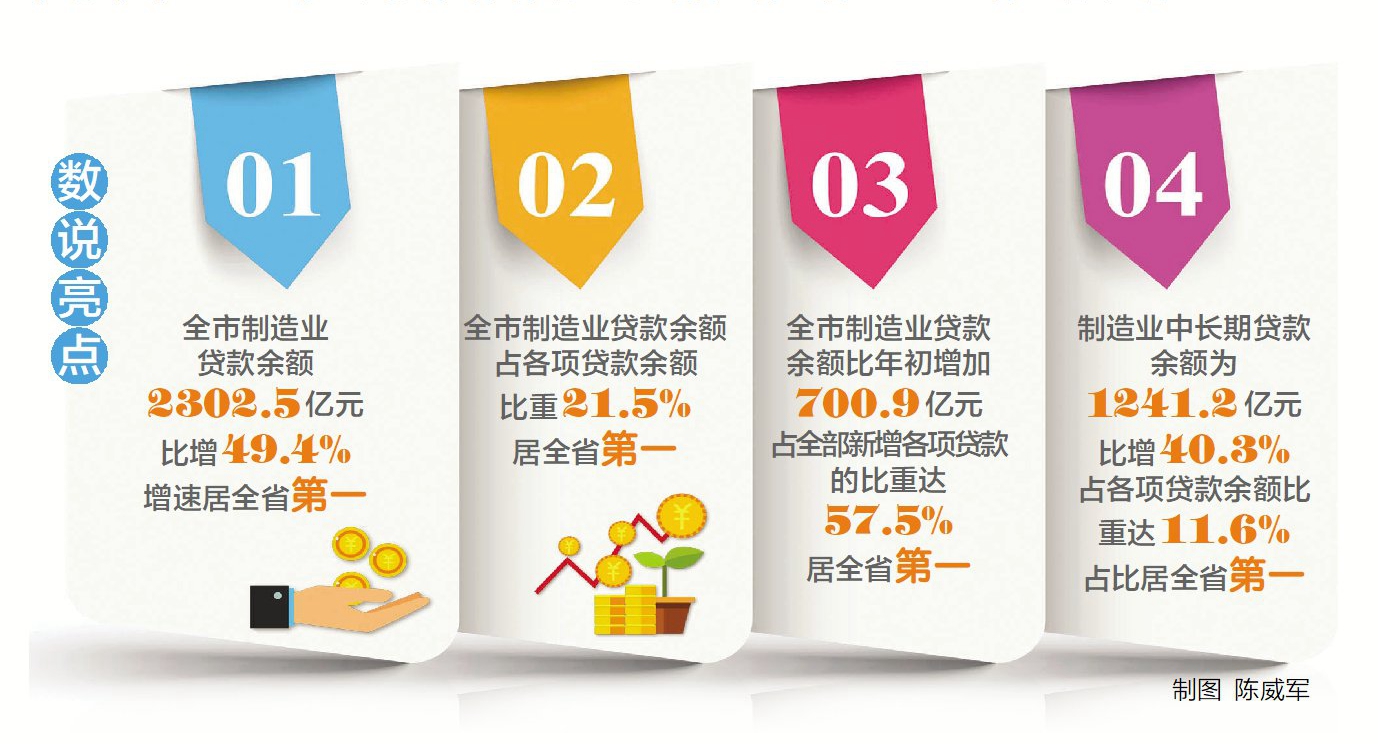 同時,制造業貸款4項指標排名保持全省第一。數據顯示,截至9月末,全市制造業貸款余額2302.5億元,同比增長49.4%,增速居全省第一;占各項貸款余額比重21.5%,居全省第一;比年初增加700.9億元,占全部新增各項貸款的比重達57.5%,居全省第一;制造業中長期貸款余額為1241.2億元,比年初增加280.4億元,同比增長40.3%,占各項貸款余額比重達11.6%,占比居全省第一。