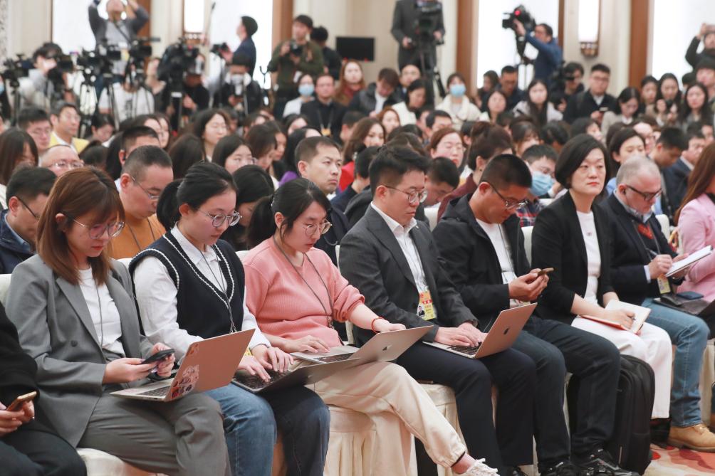 3月4日,十四屆全國人大二次會議在北京人民大會堂舉行新聞發布會。大會發言人婁勤儉就大會議程和人大工作相關問題回答中外記者的提問。這是記者在發布會上采訪。