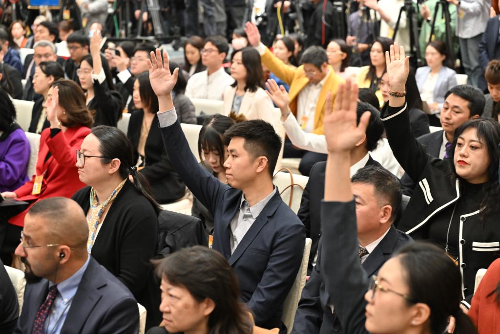 3月4日,十四屆全國人大二次會議在北京人民大會堂舉行新聞發布會。大會發言人婁勤儉就大會議程和人大工作相關問題回答中外記者的提問。這是記者舉手提問。