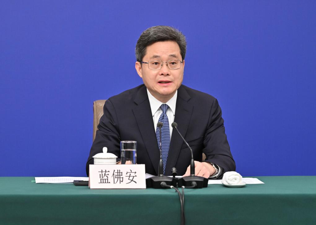 3月6日,十四屆全國人大二次會議在北京梅地亞中心新聞發布廳舉行記者會。國家發展和改革委員會主任鄭柵潔、財政部部長藍佛安、商務部部長王文濤、中國人民銀行行長潘功勝、中國證券監督管理委員會主席吳清就發展改革、財政預算、商務、金融證券等相關問題回答中外記者提問。這是藍佛安在回答記者提問。
