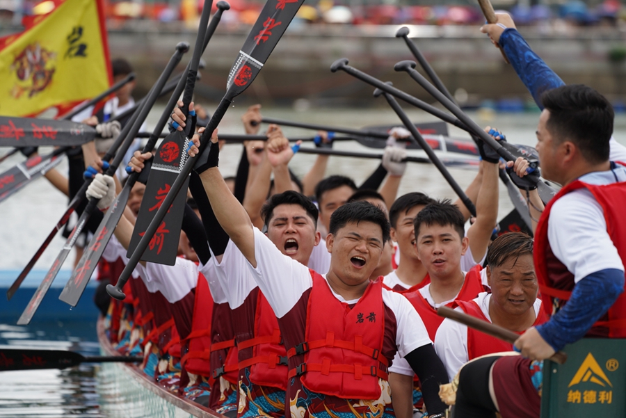 起步爭先、加速追逐、并駕超越、拼搏反超……海面上,龍舟競渡,選手們揮槳如飛,一路劈波斬浪,向著終點奮力沖刺。岸上,人頭攢動,綿綿細雨也絲毫沒有影響市民觀賽的熱情,加油吶喊聲此起彼伏,氣氛十分熱烈。競技的激情與觀眾的熱情交織在一起,令人熱血沸騰。