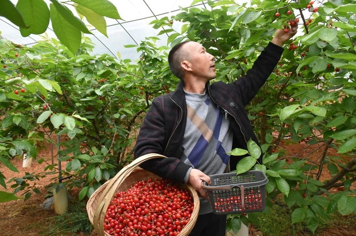 貴州省畢節(jié)市納雍縣厙東關(guān)鄉(xiāng)陶營村村民在自家果園里采摘櫻桃(2022年4月16日攝)。新華社記者 李凡 攝