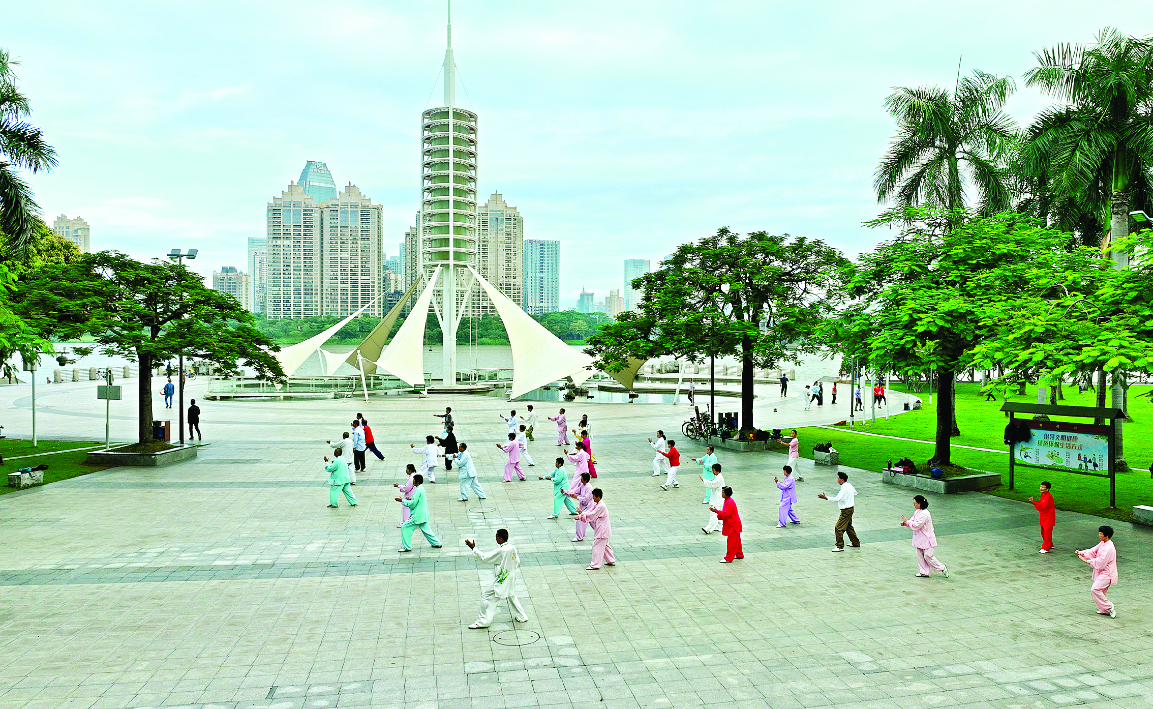 市民在市區(qū)東江沙公園打太極拳。惠州日報記者鐘暢新 攝