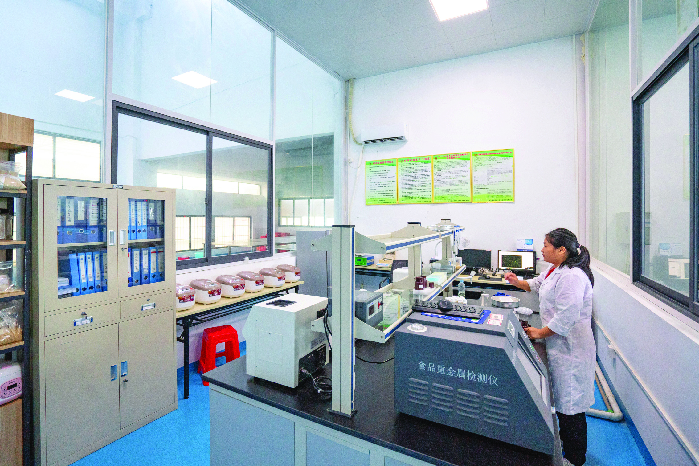 龍門縣現代農業產業園內工作人員正對大米進行檢測。