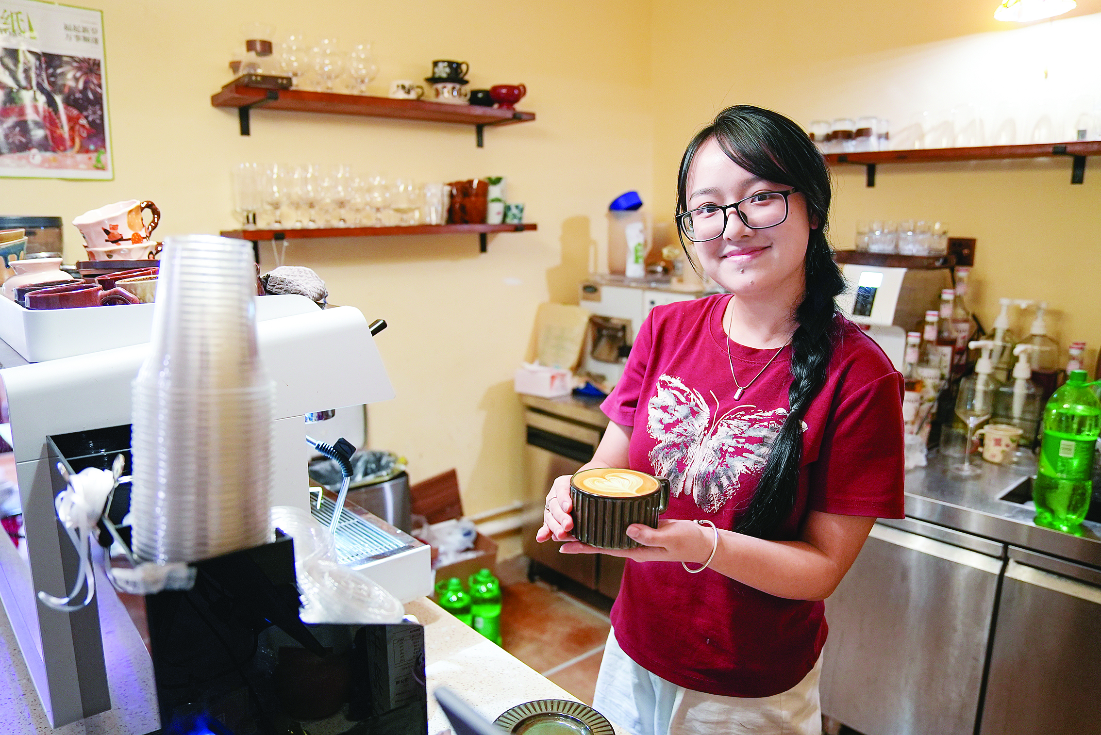 午后的“河畔cafe”客人不多,陽(yáng)光透過(guò)百葉窗照在藤椅上,留聲機(jī)里傳來(lái)悠揚(yáng)的旋律、吧臺(tái)后面飄出陣陣咖啡香氣……不少來(lái)店里“打卡”過(guò)的年輕人稱這里“自帶復(fù)古氣息”又有“度假的松弛感”。
