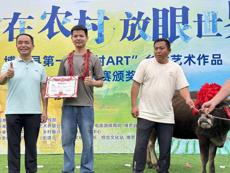 值得關(guān)注的還有,本次大賽的獎品也是“村味”十足,可謂“牛氣沖天”。一等獎獎品為一頭黃牛,二、三等獎分別獎勵羊、鵝等。獲獎?wù)哌獲得羅浮山下·蘭門村入住一晚、畫材一套,讓這場文化盛宴增添鄉(xiāng)土氣息和農(nóng)趣風情。