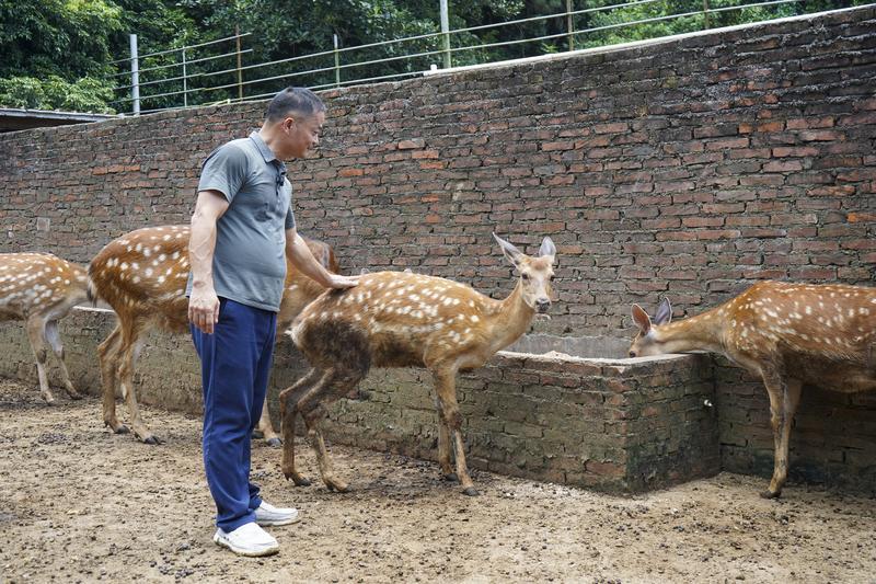 陳折鋒的養鹿場在祺龍新村小組,這里綠樹掩映,環境優美。記者采訪時,陳折鋒正在鹿場里忙碌著。酷暑中,他在清掃鹿場,給鹿添水、喂食,不一會兒工夫,汗水就浸濕了他的衣服,豆大的汗珠從額頭和臉頰上流下。“鹿要保持干凈。”陳折鋒每天都會把鹿場清理干凈,為梅花鹿提供良好的生長環境。