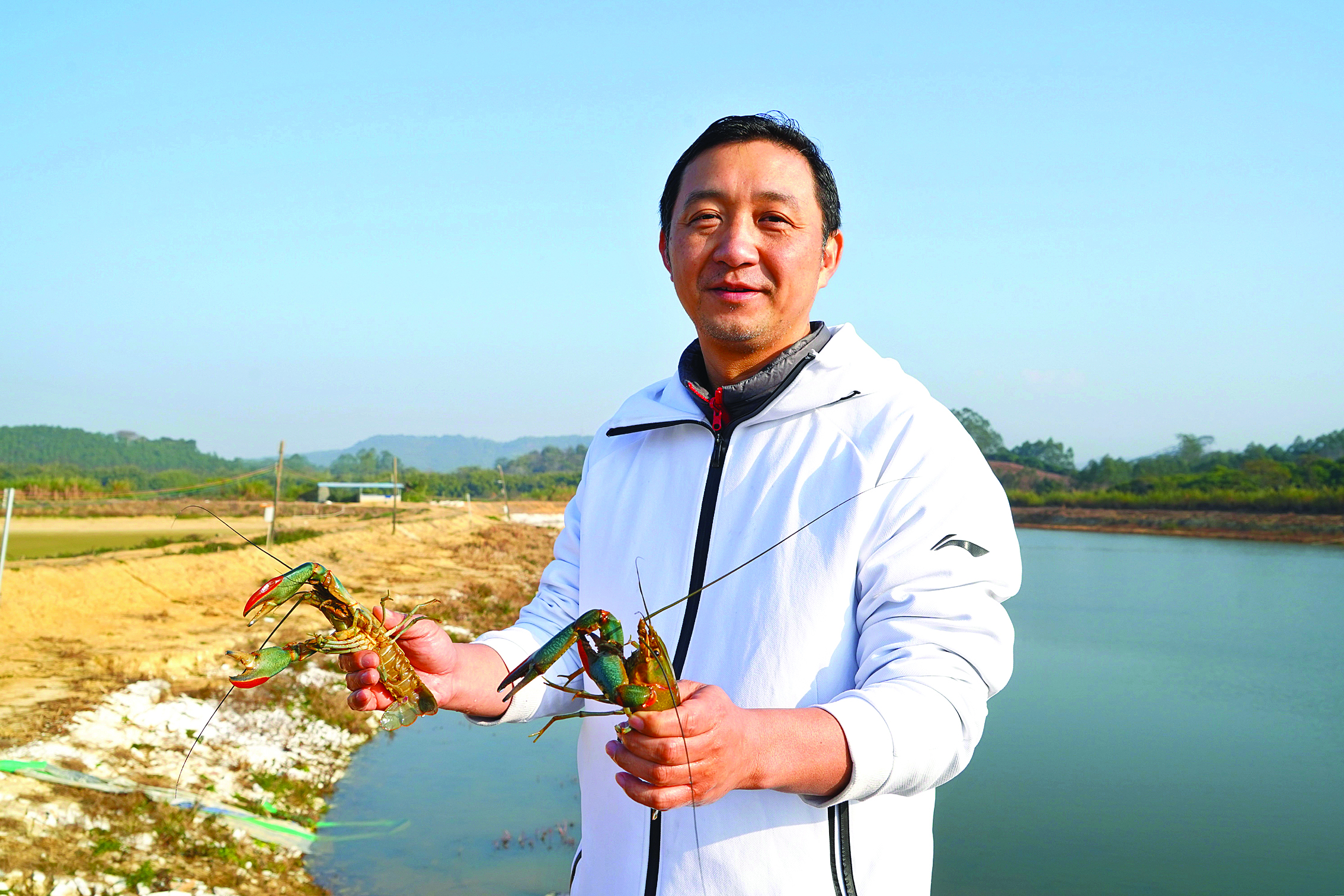 養(yǎng)殖基地負(fù)責(zé)人展示澳洲淡水龍蝦。 惠州日?qǐng)?bào)記者肖泓 羅劍業(yè) 攝