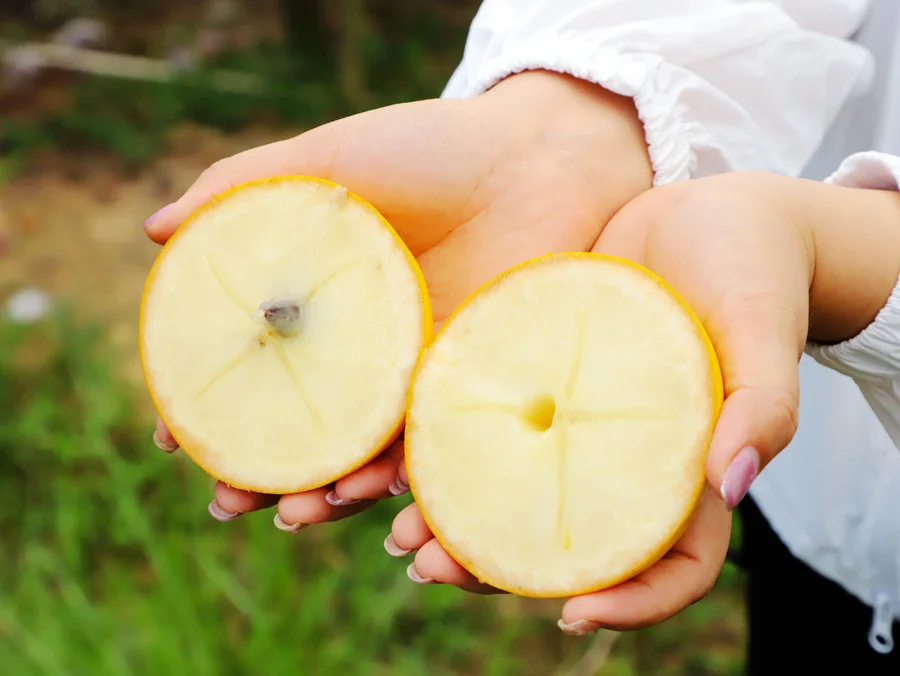 新鮮摘下的黃晶果,顏色黃亮表皮光滑,圓滾滾得像一個小瓜。用刀切開時有微黏的乳汁,與表皮的鮮黃不同,黃晶果的果肉呈奶白色半透明的膠質狀,聞起來有一股鮮甜的奶香味,吃起來則有明顯的冰糖味,口感綿柔爽滑,像果凍一般。“如果放到冰箱冷藏一下會更好吃,就像吃冰淇淋一樣。”這片采摘基地負責人徐蘭治介紹,黃晶果的甜度適宜,甜度在15、16度,口感上不會太甜,適合大部分人的口感,而且黃晶果富含膠原蛋白,果膠豐富,有消食和清腸的功效。由于口感清潤營養豐富,黃晶果也有“果中燕窩”的美譽。