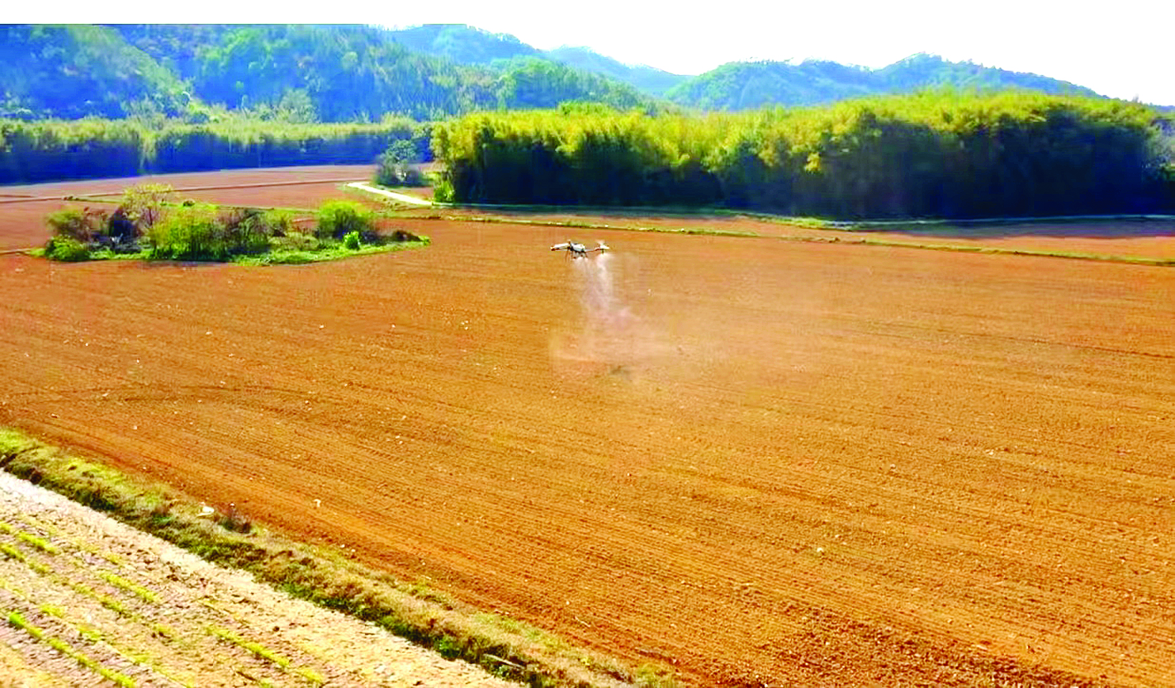 在蘆洲鎮嵐星村標準農田里,機械轟鳴,三臺翻地機正編隊作業翻耕土地。插秧機在田間演示,一株株玄脂米秧苗隨機械臂擺動快速植入泥中。無人機銀翼旋轉,將微量元素肥料均勻播撒。據了解,嵐星村今年春種玄脂米50畝。