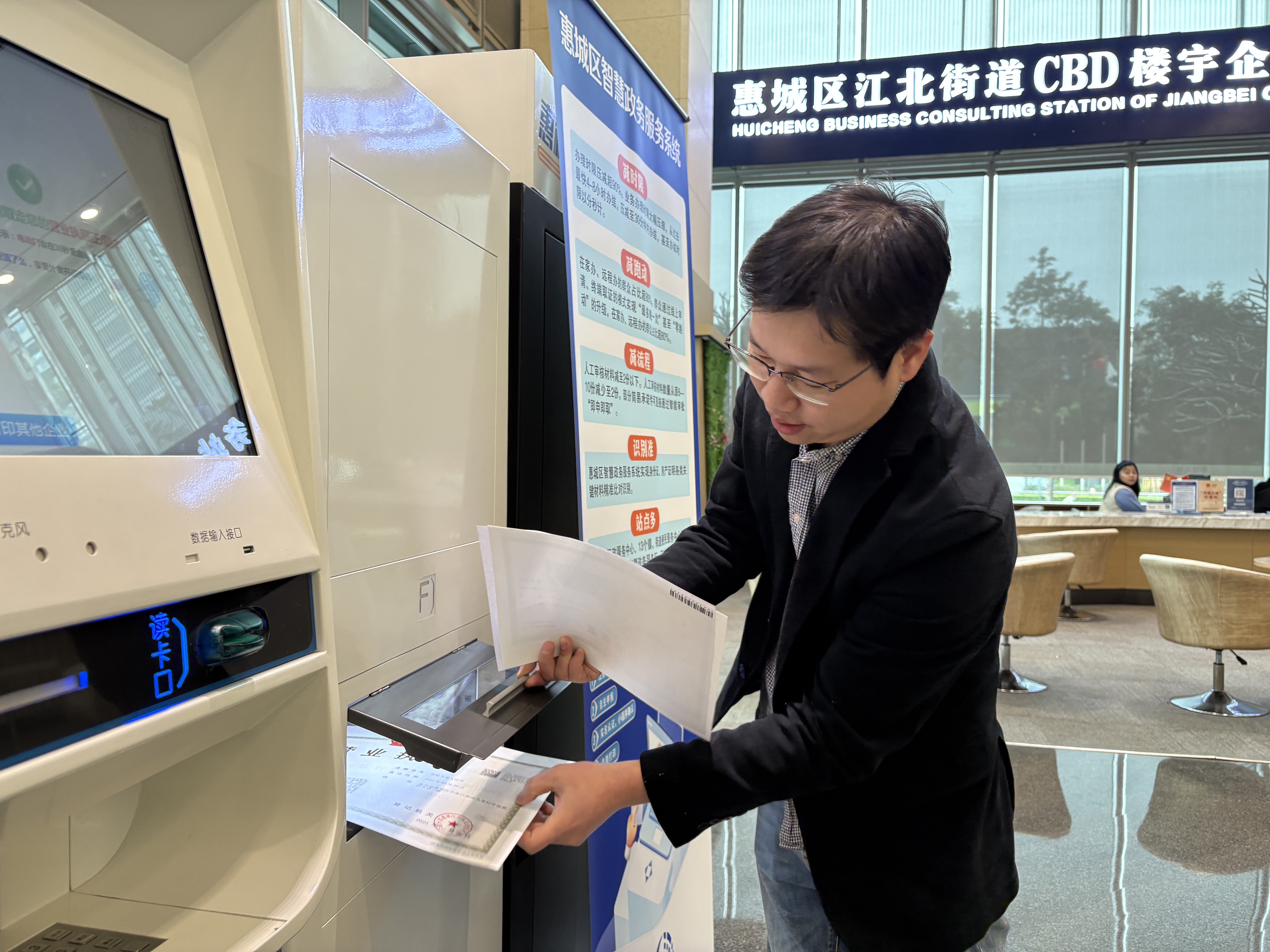 在惠城區(qū)江北街道華貿(mào)天地CBD樓宇企業(yè)服務(wù)站,市民杜雨峻僅用15分鐘就完成公司注冊(cè)的所有手續(xù)。“以前要跑好幾趟,現(xiàn)在動(dòng)動(dòng)手指就能線上搞定,樓下的自助機(jī)就能打印營(yíng)業(yè)執(zhí)照。”