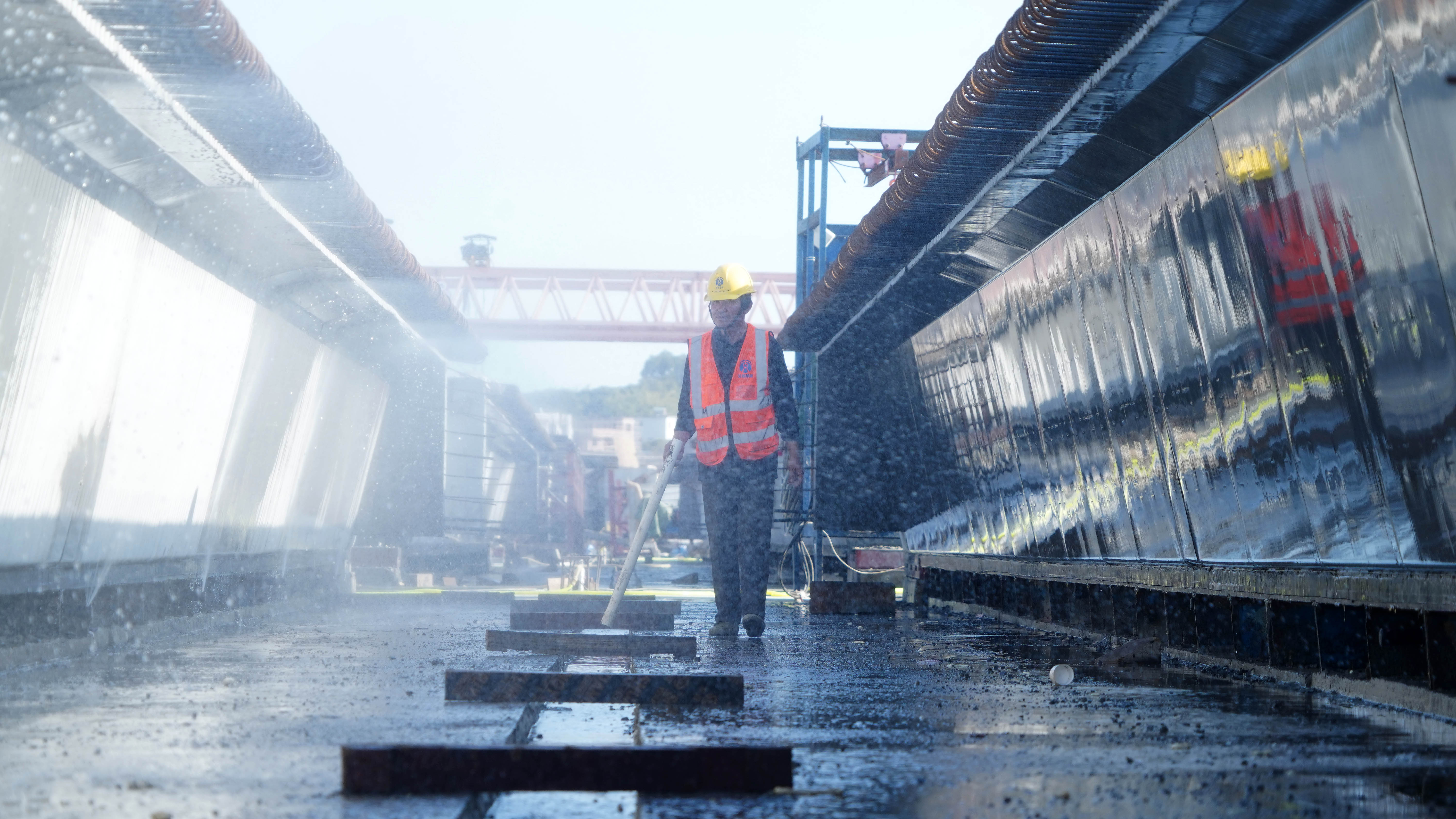 在7號制梁場,一片片預制梁整齊地擺放在場內,工人正在進行預制梁養護。