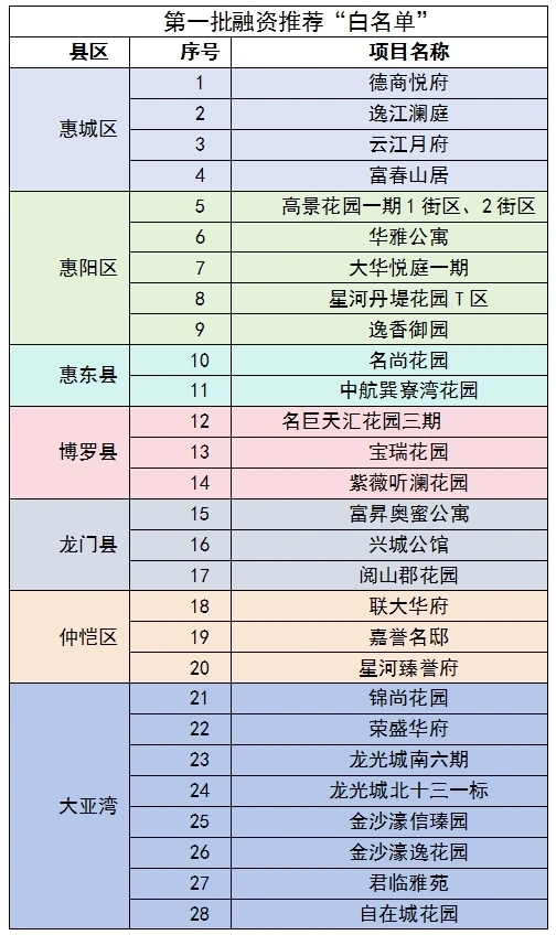 日前,第一批項(xiàng)目名單出爐了!28個(gè)房地產(chǎn)項(xiàng)目被列入融資推薦“白名單”,涵蓋惠州各縣區(qū),其中惠城區(qū)4個(gè),惠陽(yáng)區(qū)5個(gè),惠東縣2個(gè),博羅縣3個(gè),龍門縣3個(gè),仲愷高新區(qū)3個(gè),大亞灣開發(fā)區(qū)8個(gè)。