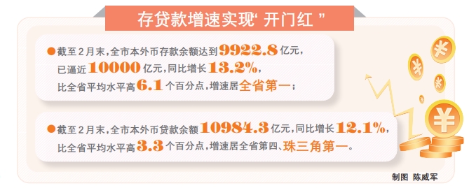 具體看,截至2月末,全市本外幣存款余額達到9922.8億元,已逼近10000億元,同比增長13.2%,比全省平均水平高6.1個百分點,增速居全省第一;全市本外幣貸款余額10984.3億元,同比增長12.1%,比全省平均水平高3.3個百分點,增速居全省第四、珠三角第一。